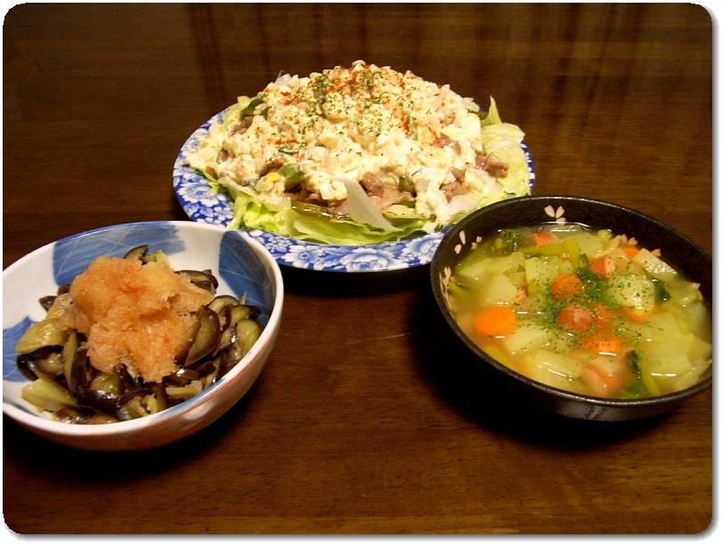 左から茄子チンしてゴマ油合えてポン酢と大根おろし掛けたのと、