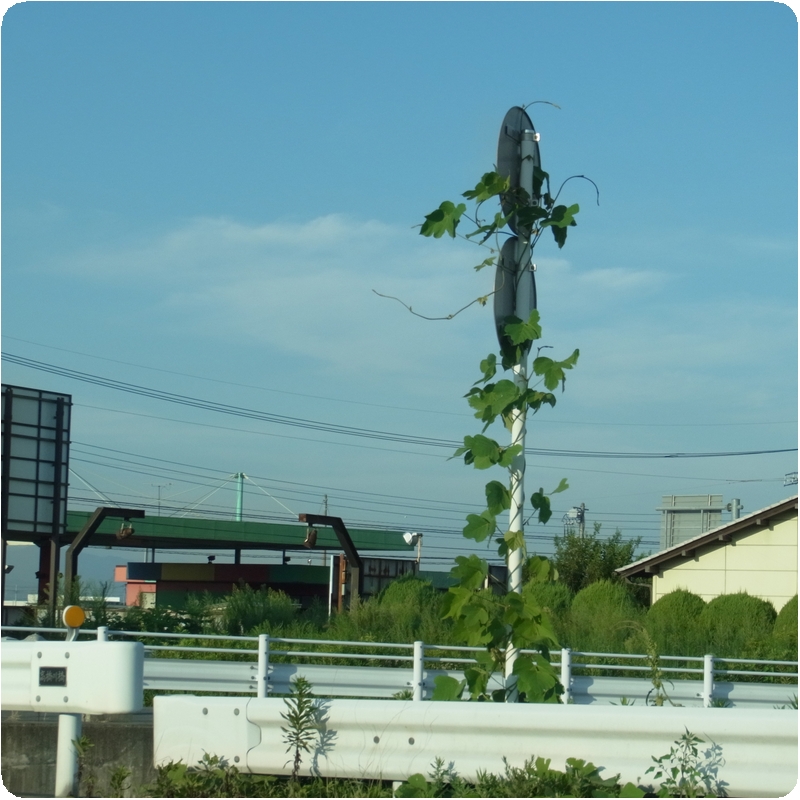 信号待ちしてる間ふと横を見ると、標識にツル植物が絡まってた。夏だなー。夏休みに朝顔の観察とか、今の小学生もやってるんだろうか。