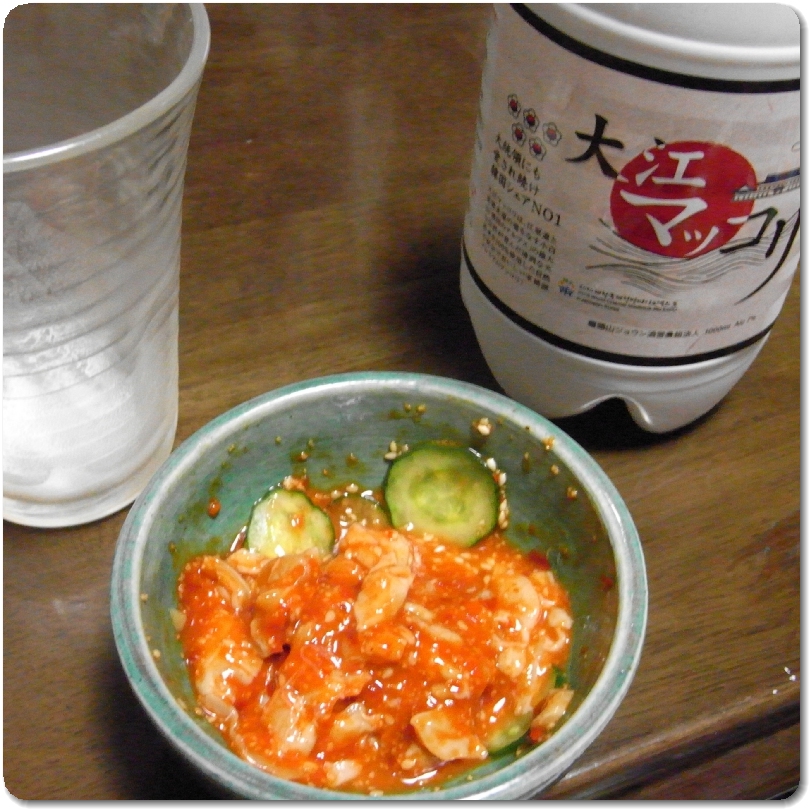 チャンジャとキュウリを合えてマッコリのアテに。焼き肉屋行ってチャンジャが無いとちょっと凹む。韓国料理屋なら必ずあるけど、行く機会皆無だしなあ。
