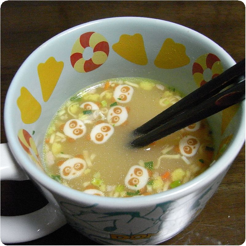 食べた事無かったんでシーフードを2つ分、400mlくらいは余裕で入るドナルドの巨大マグで作成。シーフードはなるとがパンダでした。しょうゆは相変わらずの垂れ耳犬。写真は食べ進めてから撮ったのでちょっと減ってます。
