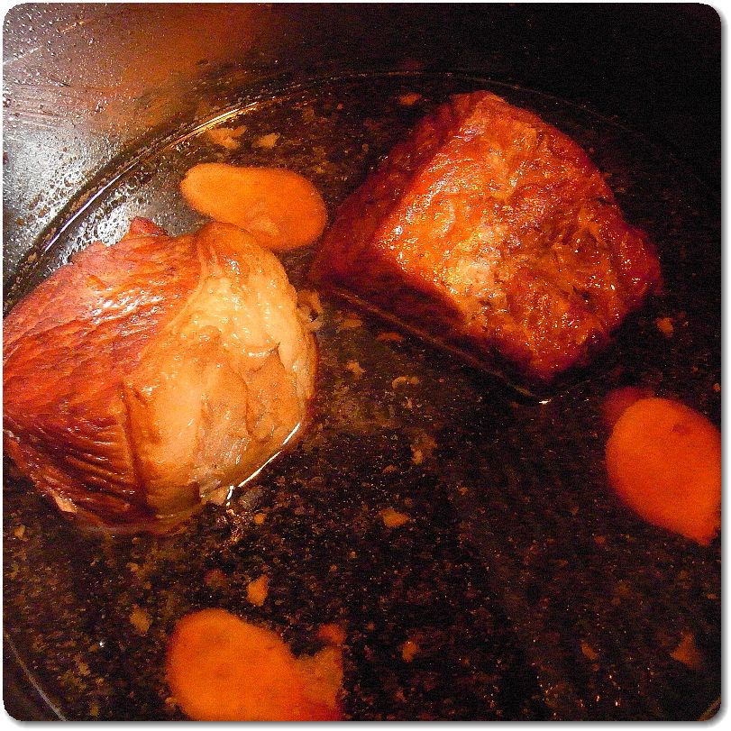 時間になったら火を止めて自然減圧。で、煮上がったのがこちら。焼き目を付けたから外は割としっかりしてるんだけど、中はホロホロ。弱火で煮て少し煮詰める。余った煮汁は卵とか大根とか、あとはジャガイモなんかを煮ても美味しい。