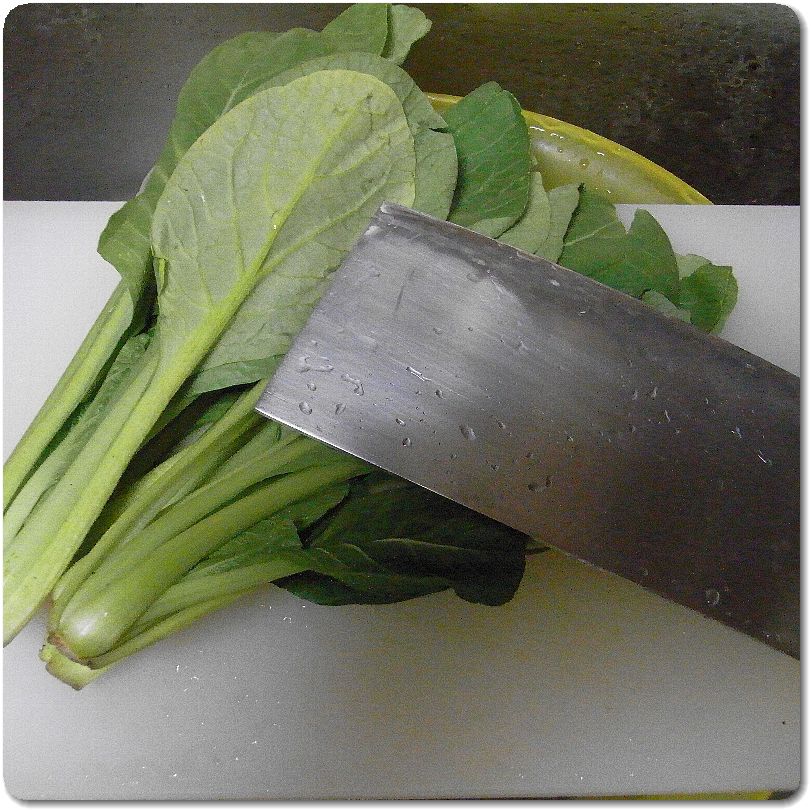 付け合わせの葉っぱ。ほうれん草が無かったんで小松菜。小松菜って味が馴染まないんだよな。まあ無いものは仕方ない。茹でて水気を切る。適当な大きさに切って皿に敷く。