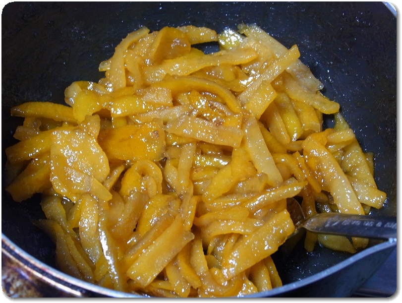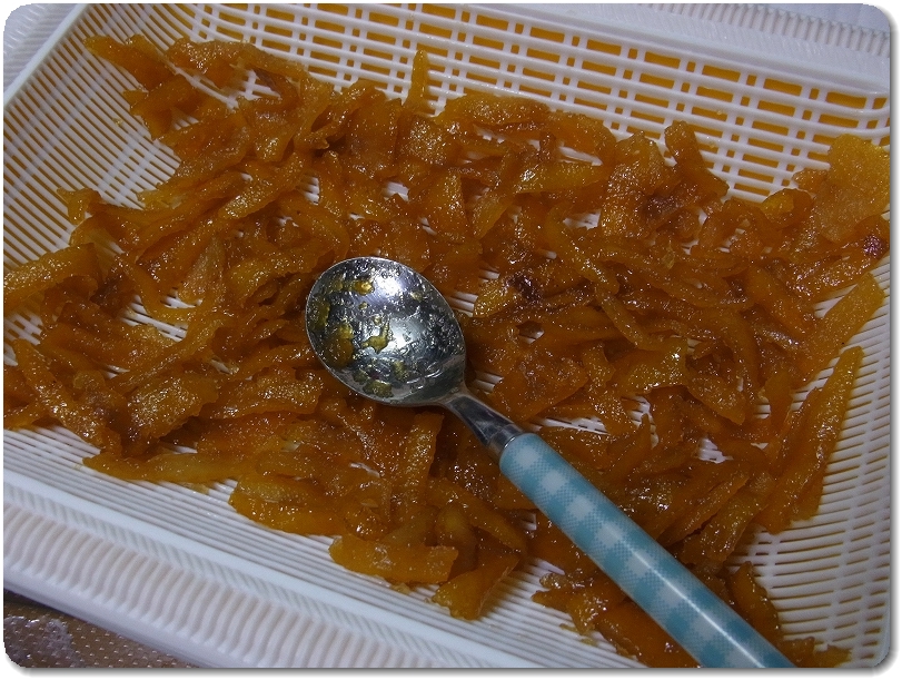 昨日職場で貰ってきた柚子の皮を砂糖で煮た奴(正式名称何?)が美味かったらしくて、貰ってきた柚子がたくさんあるからコレ作って、とわざわざ頼んできた。