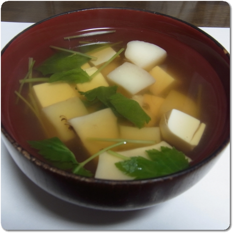 昆布と鰹で800~900mlくらい出汁を引いて、温めた所にはんぺん一枚をさいの目にしたやつ投入。ホントは鱧とか使うんだろうけど、そんなもん家にはないしその辺にも売ってない。
