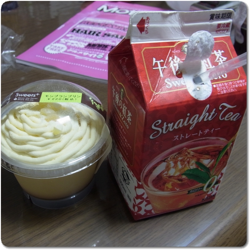 代わりに買ってきたモンブランプリンとパックの午後ティー(試しにthiーで入力)でゲーム前の糖分補給。