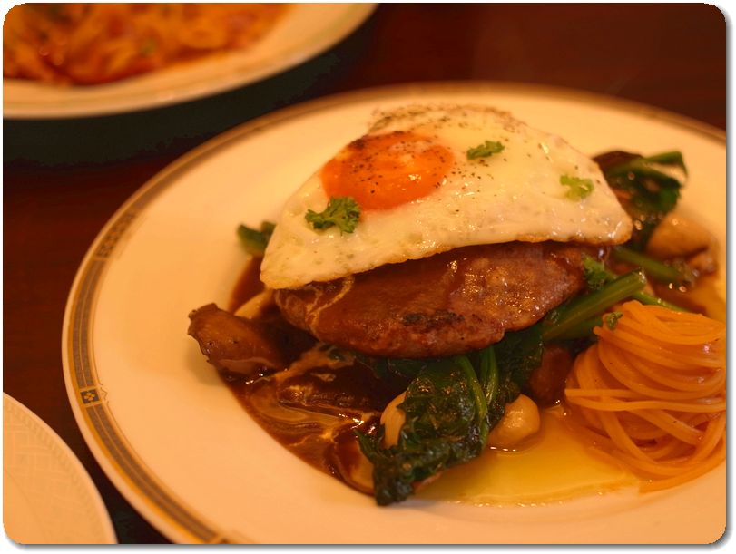 我夢はハンバーグを頼みました。いつもカレーばっか食ってたから初めて食べたんだけど、ナツメグの加減が丁度良くてこれも美味しい。ソースもハンバーグを邪魔してないし。欲を云えばもう少し練ってない方が好きかな。食感が少しつくねっぽい。
