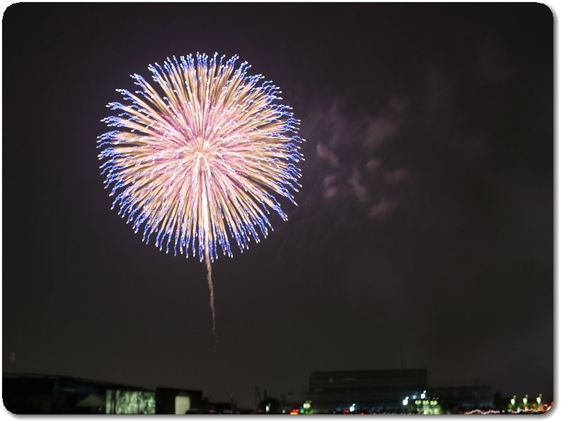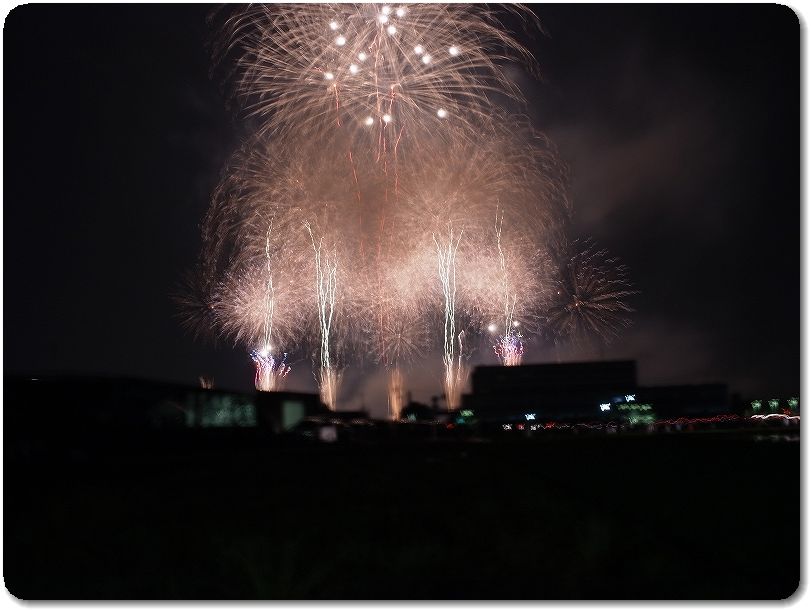 肝心の花火ですよ花火。単焦点だし、三脚は車の中だし、SDはPCに差しっぱなしだし、かなり酔ってるしと散々な撮影状況の中、手持ちで6~8秒露光。本体メモリだと8枚しか撮れなかった。
