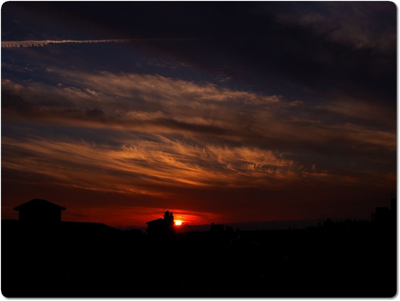 宿からの夕焼け。海から小一時間くらい内陸に入ったところだから海に沈むわけではないけど。